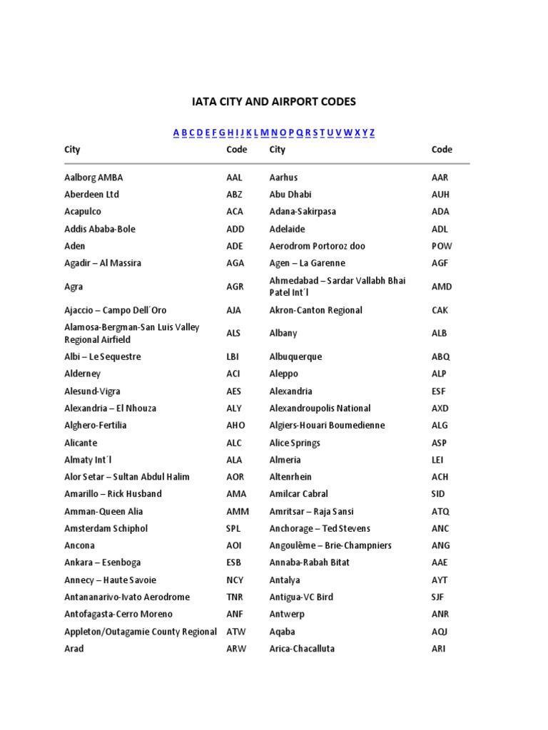 Aalborg Denmark AAL Aalesund Norway AES Aarhus Denmark AAR Abbotsford BC Canada YXX Aberdeen Scotland ABZ Aberdeen SD USA ABR. This airline and location code search engine provides an official source for codes assigned by IATA. Get airport flight travel transportation info for 35 airports in Afghanistan.